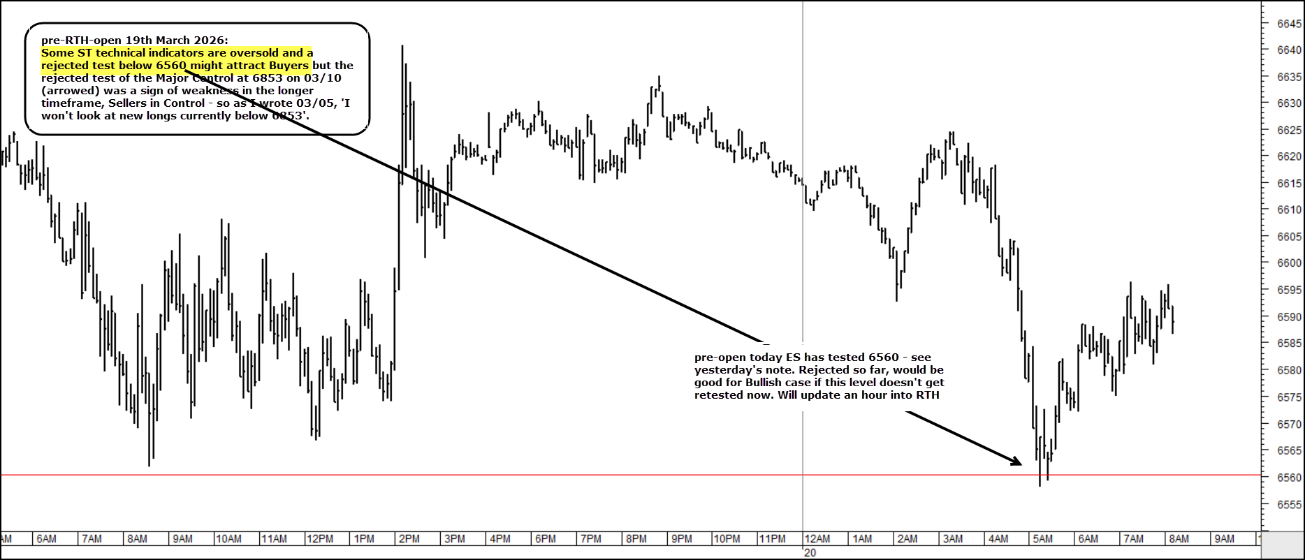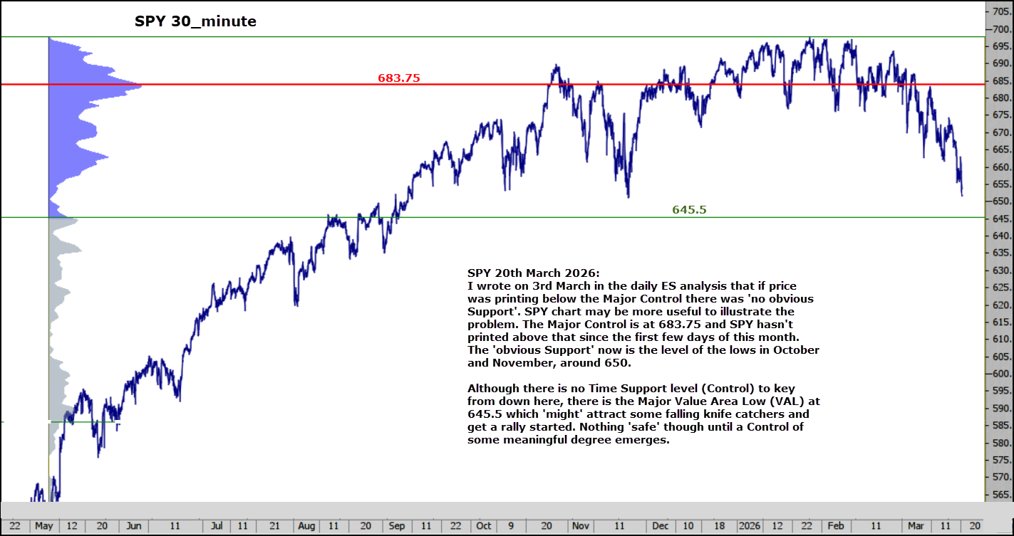I wrote on 3rd March in the daily ES analysis that if price was printing below the Major Control there was ‘no obvious Support’. SPY chart may be more useful to illustrate the problem. The Major Control is at 683.75 and SPY hasn’t printed above that since the first few days of this month. The ‘obvious Support’ now is the level of the lows in October and November, around 650.