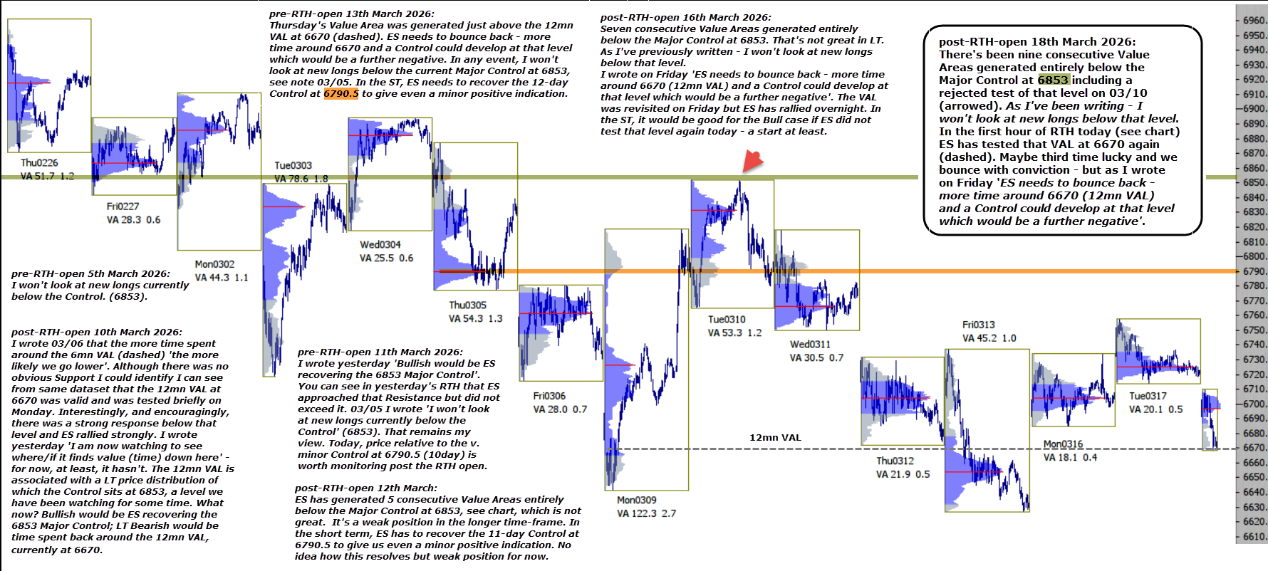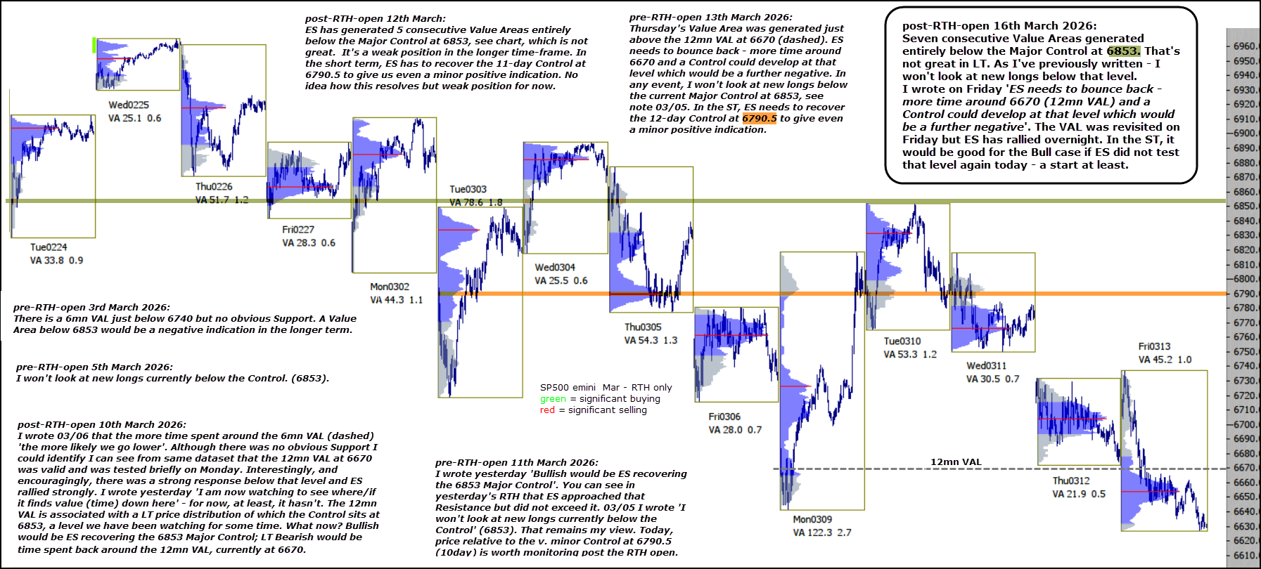 Seven consecutive Value Areas generated entirely below the Major Control at 6853. That’s not great in LT. As I’ve previously written – I won’t look at new longs below that level.