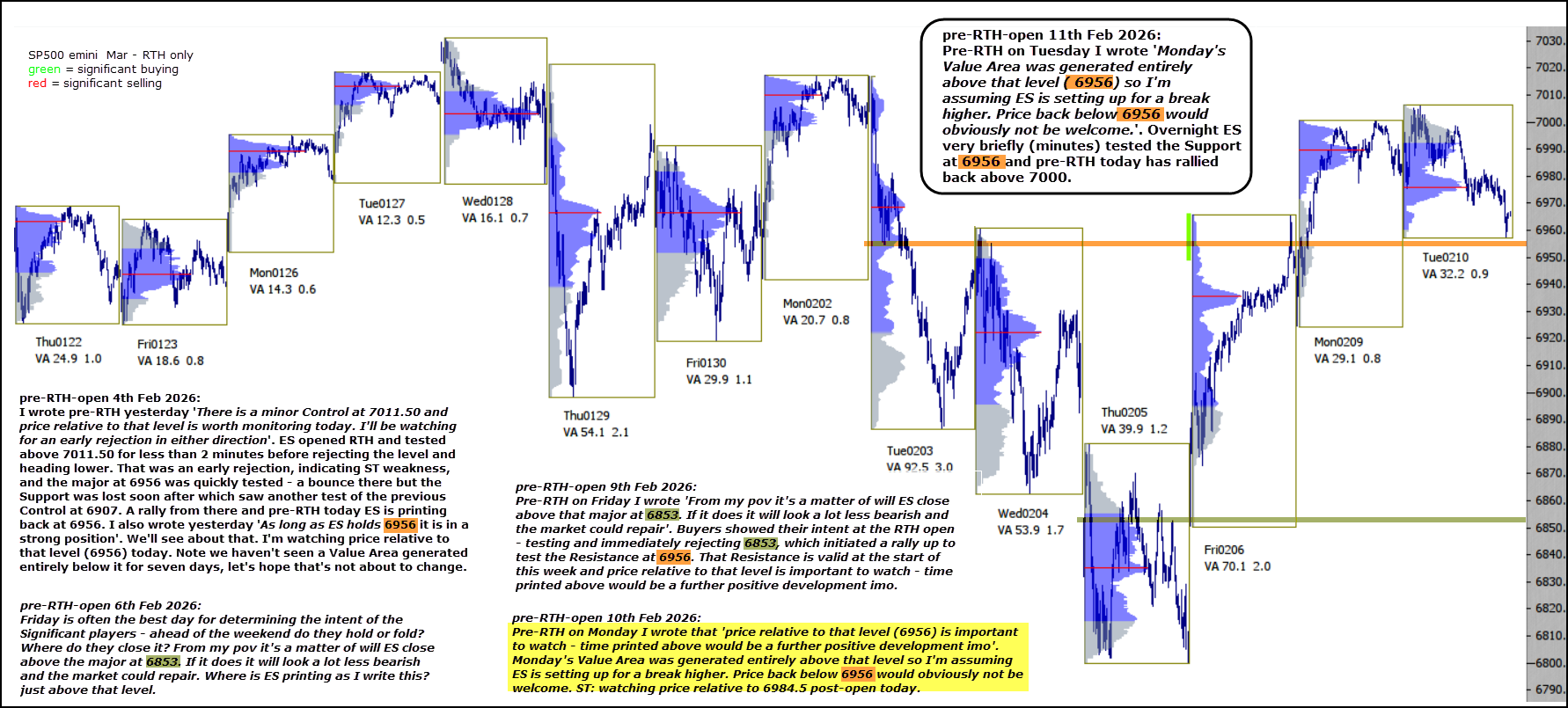 Pre-RTH on Tuesday I wrote that ‘Monday’s Value Area was generated entirely above that level ( 6956) so I’m assuming ES is setting up for a break higher. Price back below 6956 would obviously not be welcome‘.