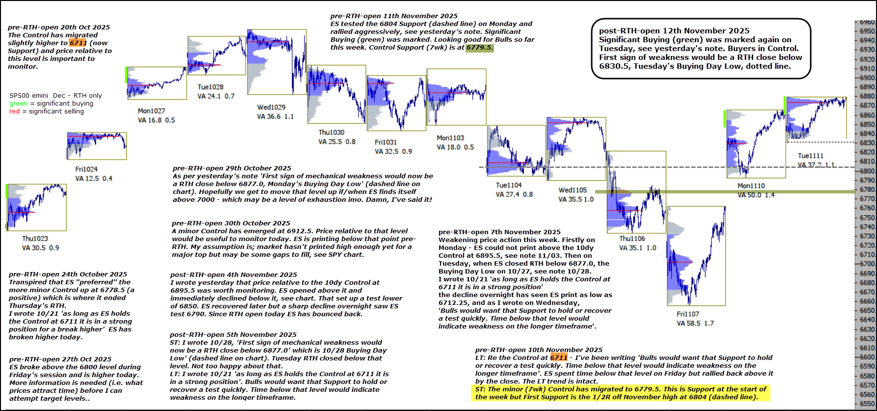 E-mini S&P 500 futures 12th November 2025 Posted on November 12, 2025 Written by Chart Prophet Significant Buying (green) was marked again on Tuesday, see yesterday’s note. Buyers in Control. First sign of weakness would be a RTH close below 6830.5, Tuesday’s Buying Day Low, dotted line.