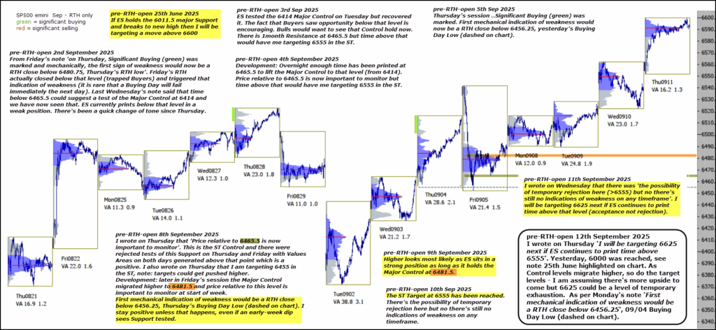 I am assuming there’s more upside to come but 6625 could be a level of temporary exhaustion. As per Monday’s note ‘First mechanical indication of weakness would be a RTH close below 6456.25‘, 09/04 Buying Day Low (dashed on chart).