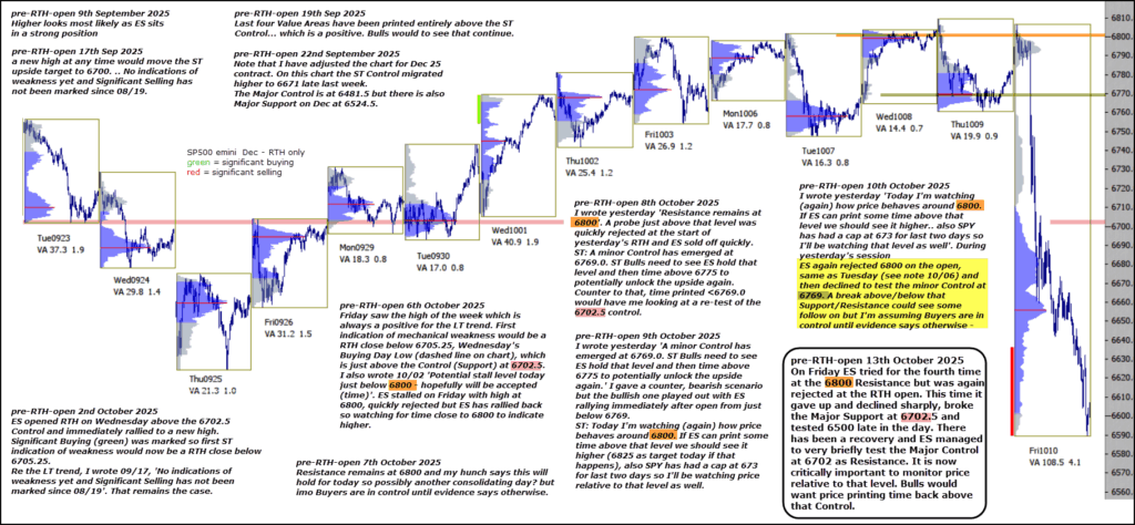 On Friday ES tried for the fourth time at the 6800 Resistance but was again rejected at the RTH open. This time it gave up and declined sharply, broke the Major Support at 6702.5 and tested 6500 late in the day. There has been a recovery and ES managed to very briefly test the Major Control at 6702 as Resistance. It is now critically important to monitor price relative to that level. Bulls would want price printing time back above that Control.