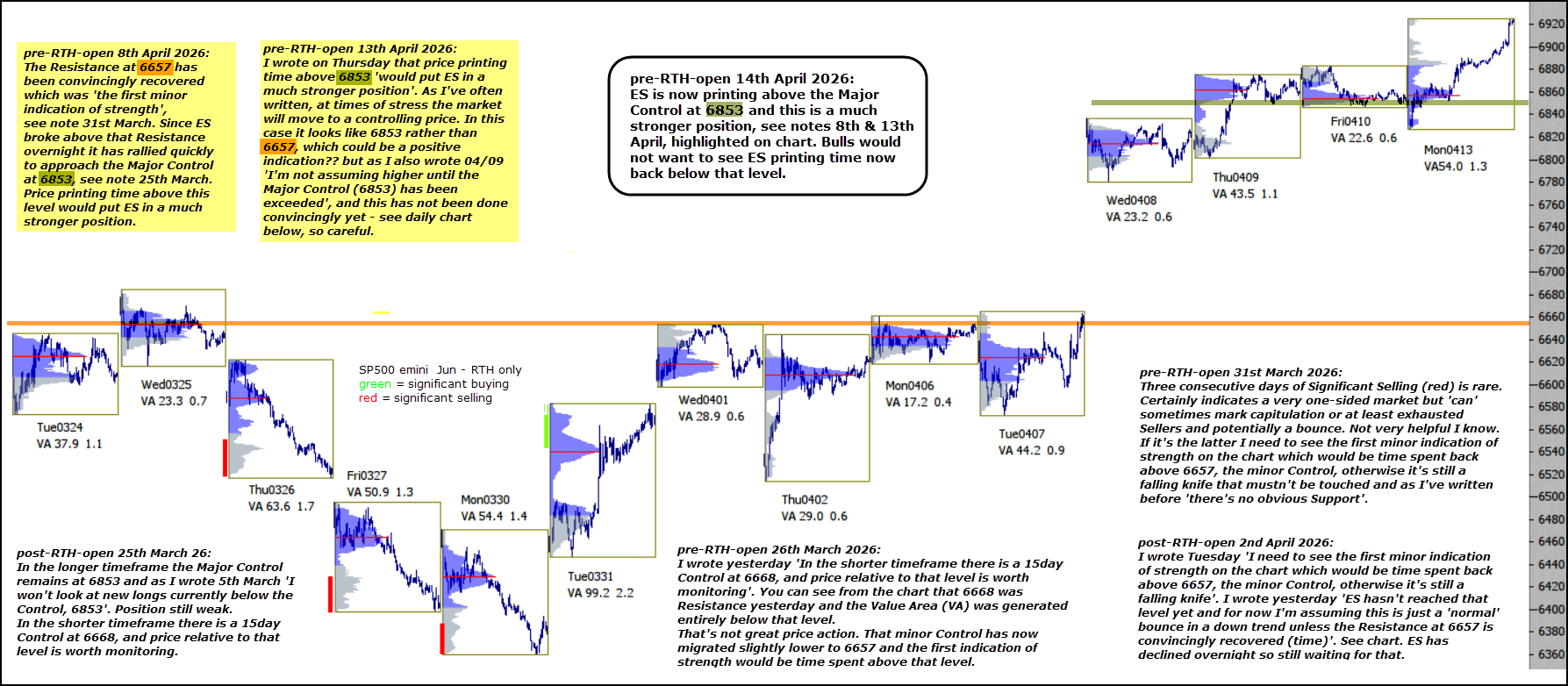 ES is now printing above the Major Control at 6853 and this is a much stronger position, see notes 4th & 8th April, highlighted on chart. Bulls would not want to see ES printing time now back below that level.
