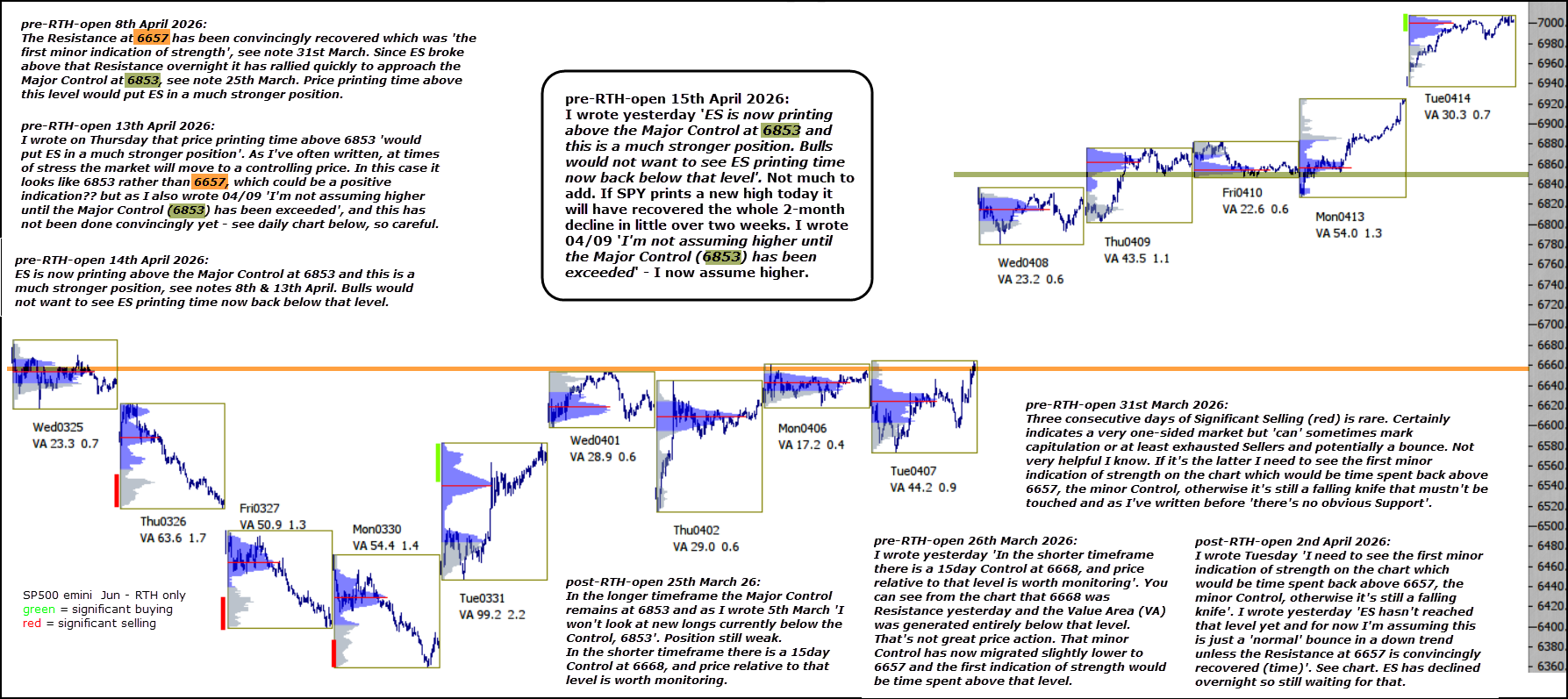 I wrote yesterday ‘ES is now printing above the Major Control at 6853 and this is a much stronger position. Bulls would not want to see ES printing time now back below that level‘. Not much to add. If SPY prints a new high today it will have recovered the whole 2-month decline in little over two weeks. I wrote 04/09 ‘I’m not assuming higher until the Major Control (6853) has been exceeded‘ – I now assume higher.