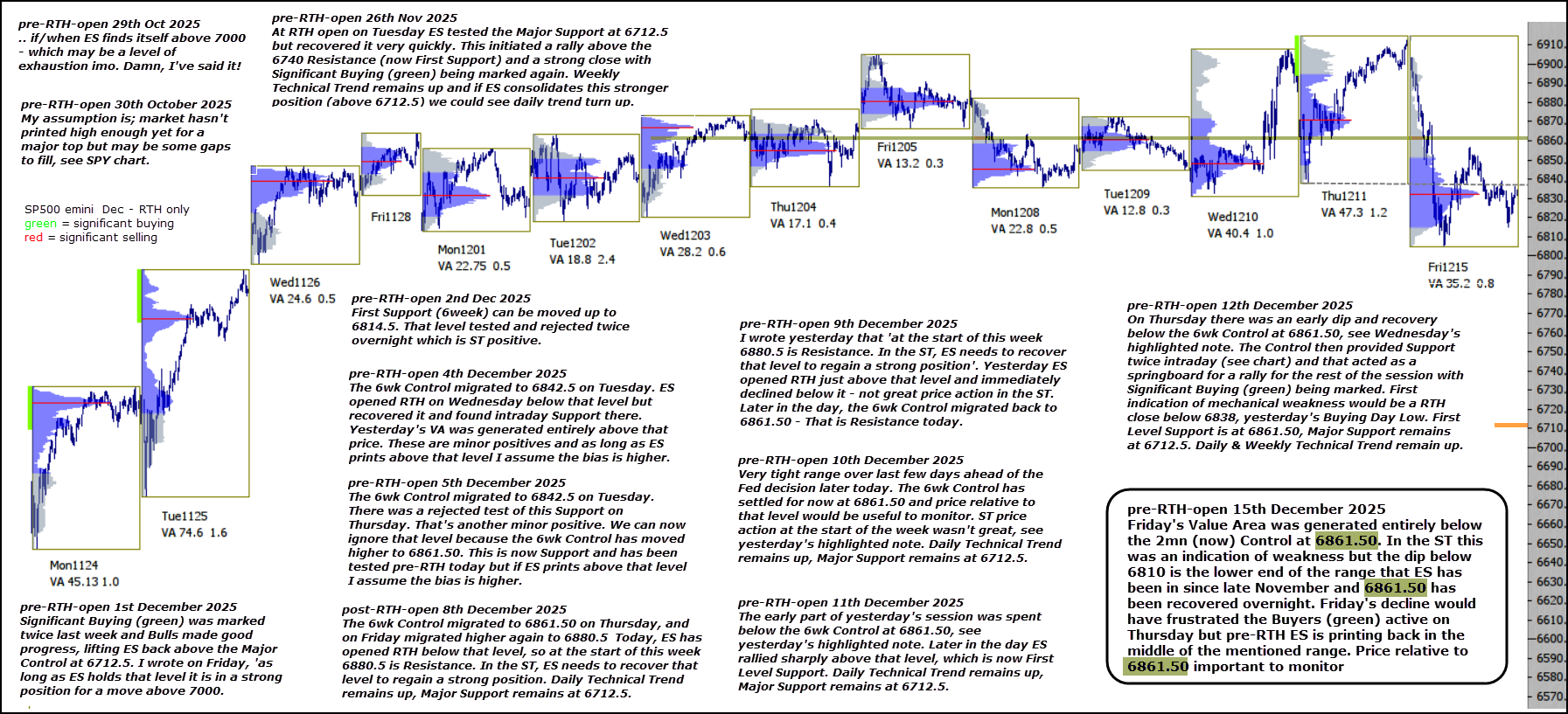 Friday’s Value Area was generated entirely below the 2mn (now) Control at 6861.50. In the ST this was an indication of weakness but the dip below 6810 is the lower end of the range that ES has been in since late November and 6861.50 has been recovered overnight. Friday’s decline would have frustrated the Buyers (green) active on Thursday but pre-RTH ES is printing back in the middle of the mentioned range. Price relative to 6861.50 important to monitor.