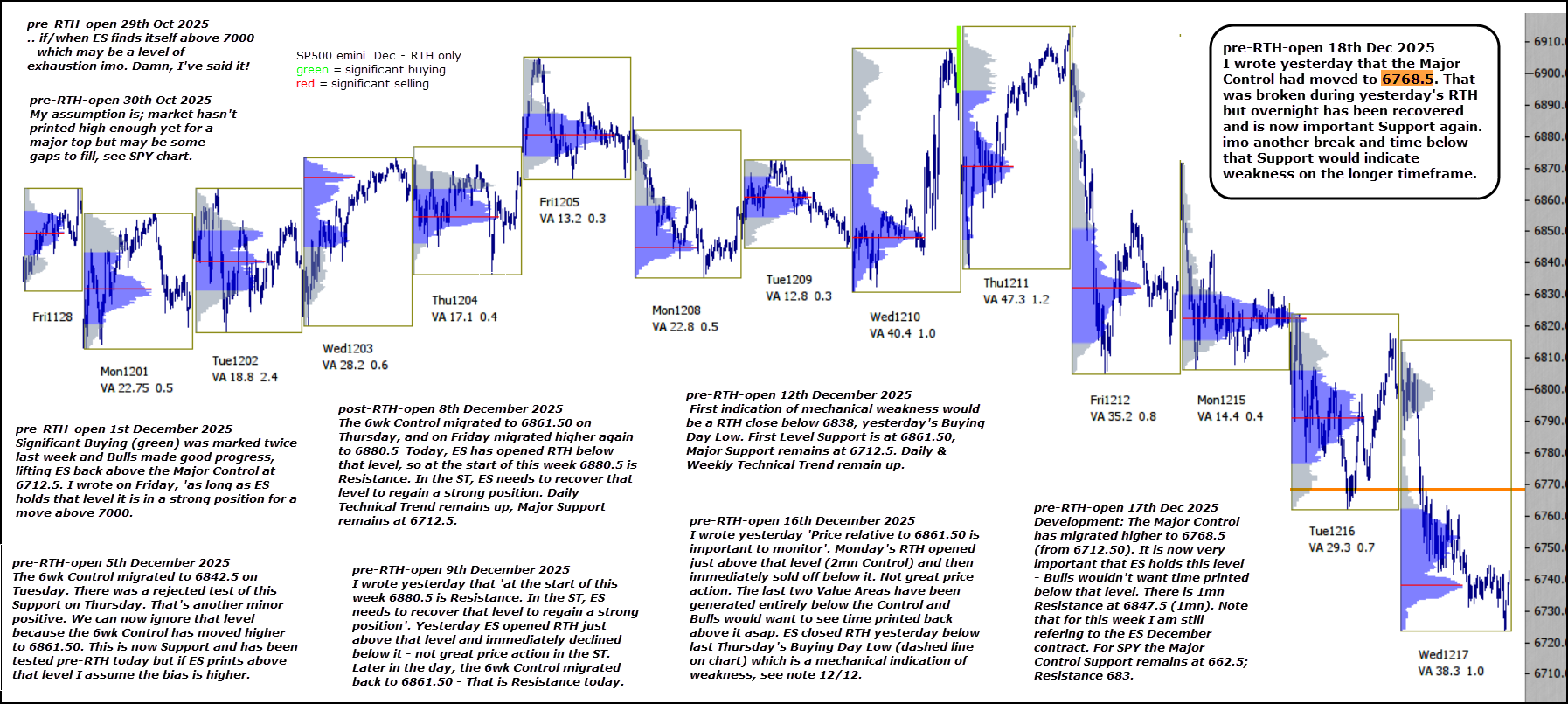 I wrote yesterday that the Major Control had moved to 6768.5. That was broken during yesterday’s RTH but overnight has been recovered and is now important Support again. imo another break and time below that Support would indicate weakness on the longer timeframe.