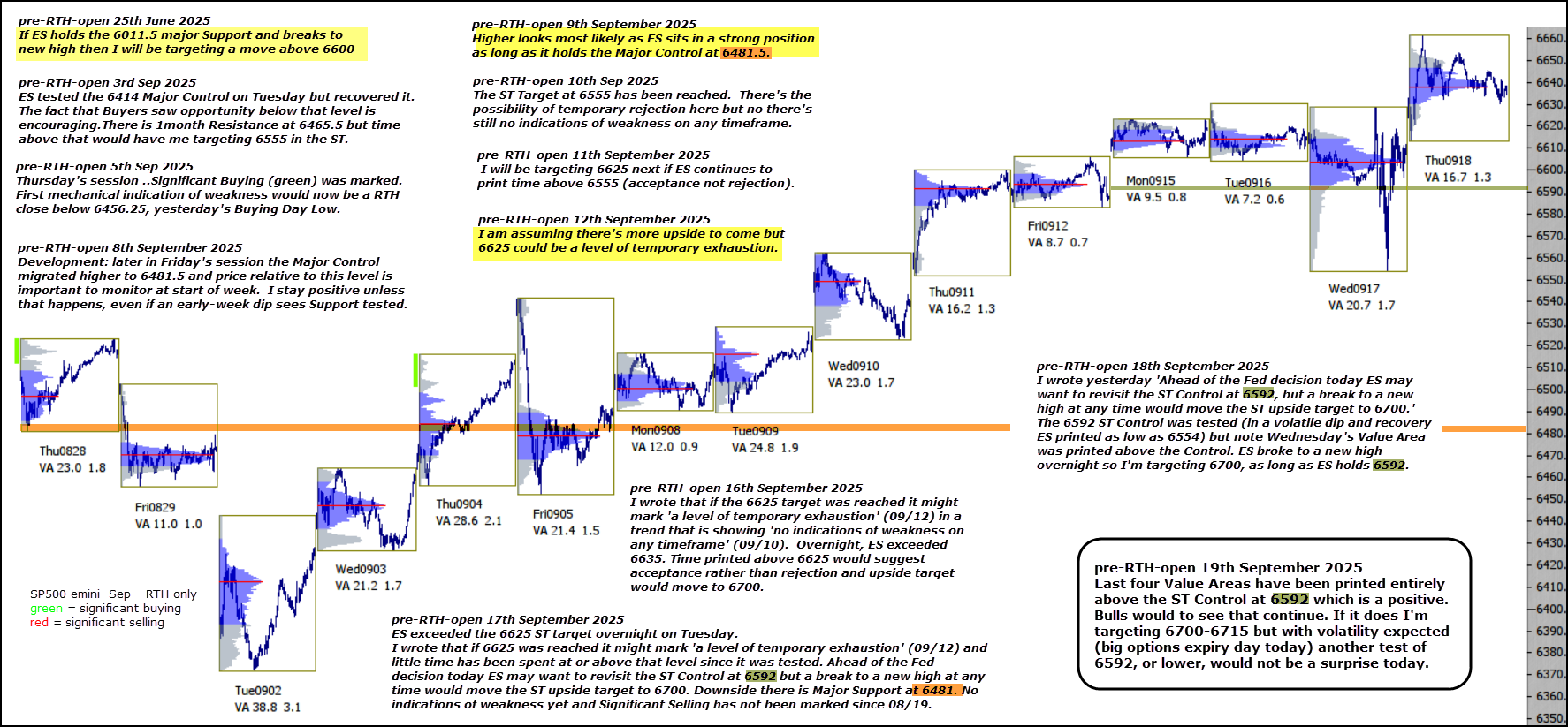 Last four Value Areas have been printed entirely above the ST Control at 6592 which is a positive. Bulls would want to see that continue. If it does I’m targeting 6700-6715 but with volatility expected (big options expiry day today) another test of 6592, or lower, would not be a surprise today.