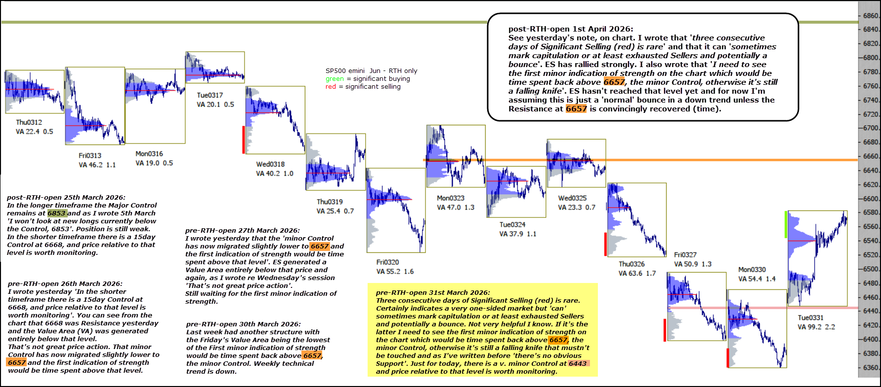 See yesterday’s note, on chart. I wrote that ‘three consecutive days of Significant Selling (red) is rare‘ and that it can ‘sometimes mark capitulation or at least exhausted Sellers and potentially a bounce‘. ES has rallied strongly. I also wrote that ‘I need to see the first minor indication of strength on the chart which would be time spent back above 6657, the minor Control, otherwise it’s still a falling knife‘.