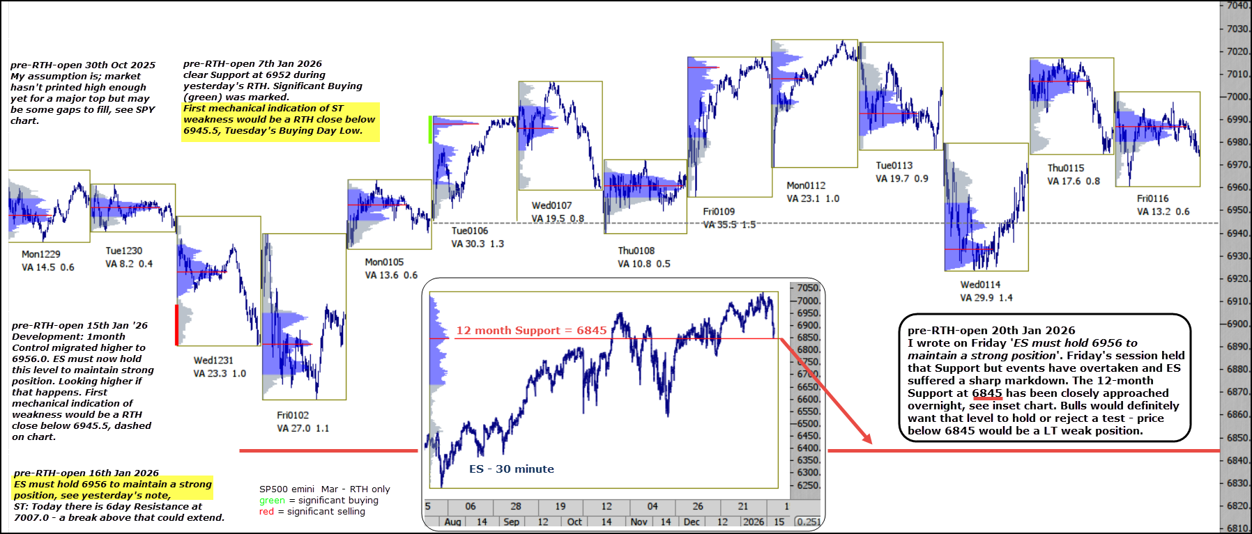 The 12-month Support at 6845 has been closely approached overnight, see inset chart. Bulls would definitely want that level to hold or reject a test – price below 6845 would be a LT weak position.