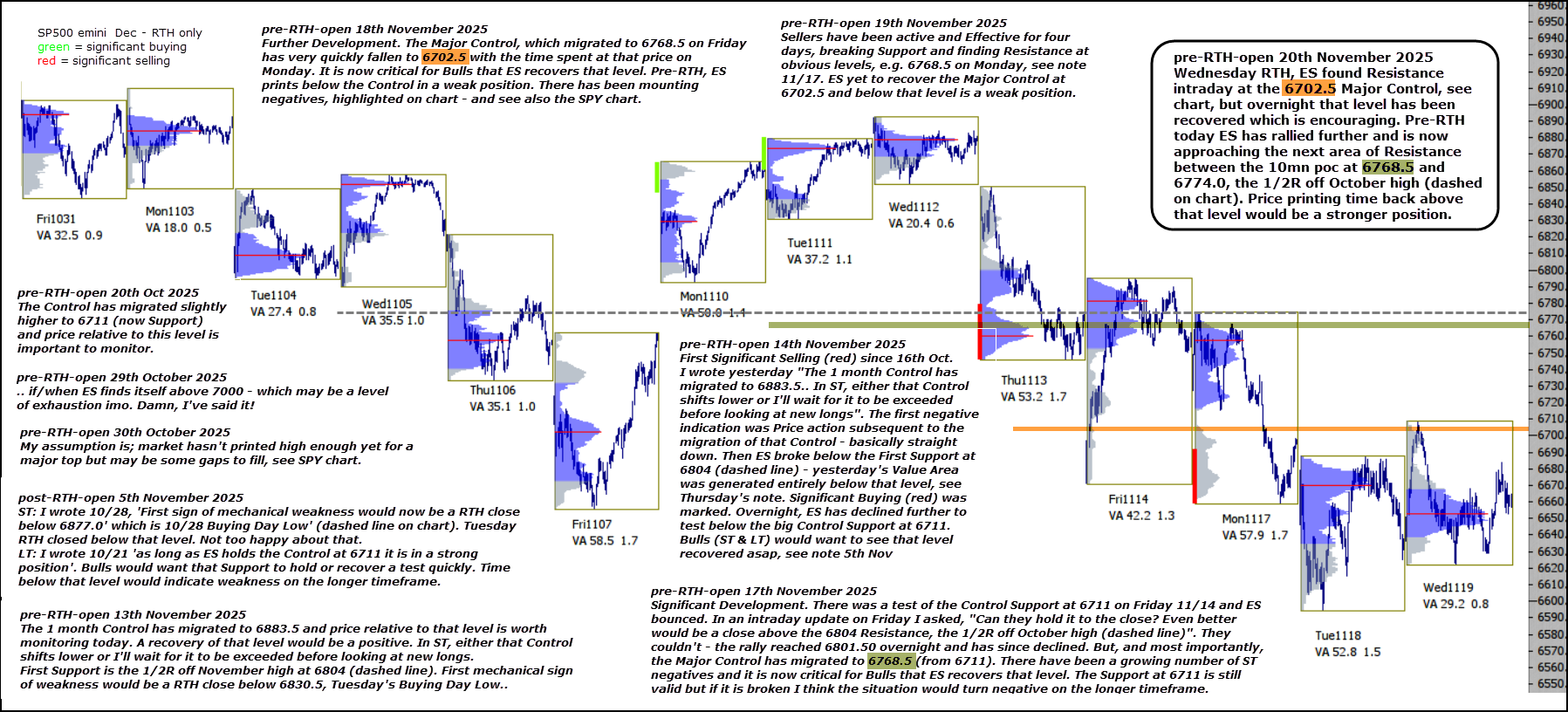 Wednesday RTH, ES found Resistance intraday at the 6702.5 Major Control, see chart, but overnight that level has been recovered which is encouraging.