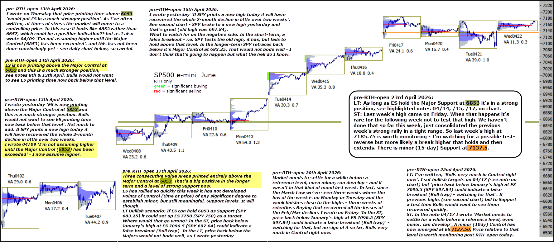LT: As long as ES hold the Major Support at 6853 it’s in a strong position, see highlighted notes 04/14, /15, /17, on chart.