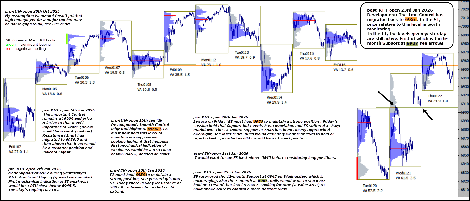 In the LT, the levels given yesterday are still active. First of which is the 6-month Support at 6907, see arrows on chart.