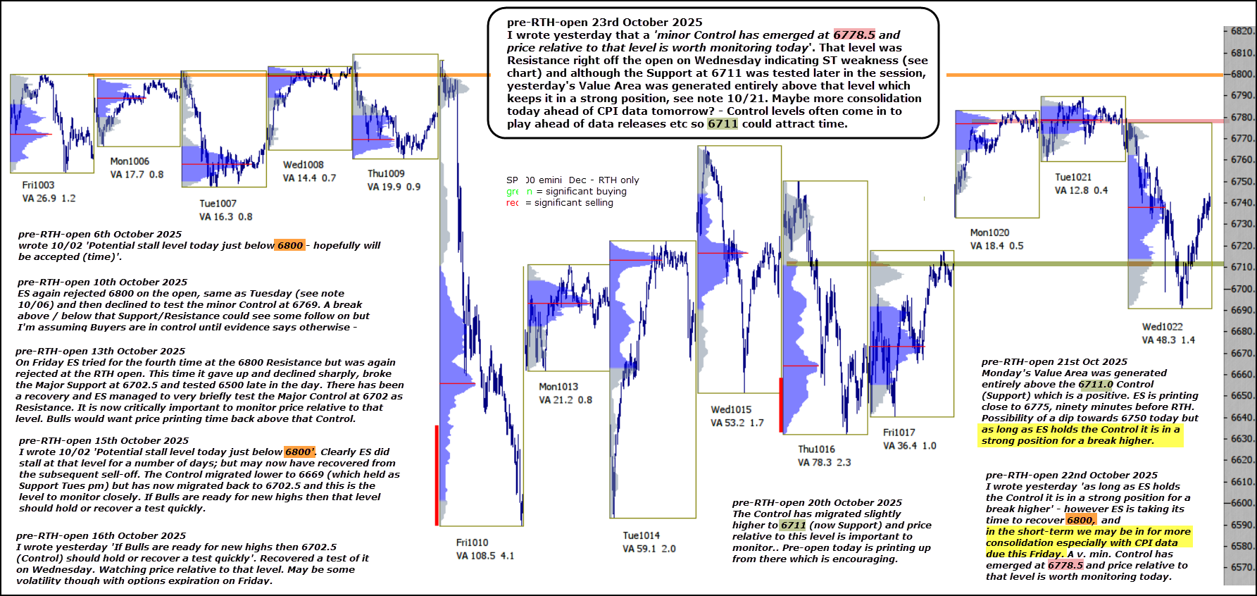 I wrote yesterday that a ‘minor Control has emerged at 6778.5 and price relative to that level is worth monitoring today‘. That level was Resistance right off the open on Wednesday indicating ST weakness (see chart) and although the Support at 6711 was tested later in the session, yesterday’s Value Area was generated entirely above that level which keeps it in a strong position, see note 10/21.