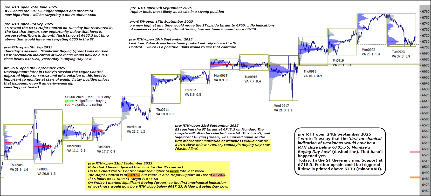 I wrote Tuesday that the ‘first mechanical indication of weakness would now be a RTH close below 6705.75, Monday’s Buying Day Low‘ (dashed line on chart). That hasn’t happened yet.