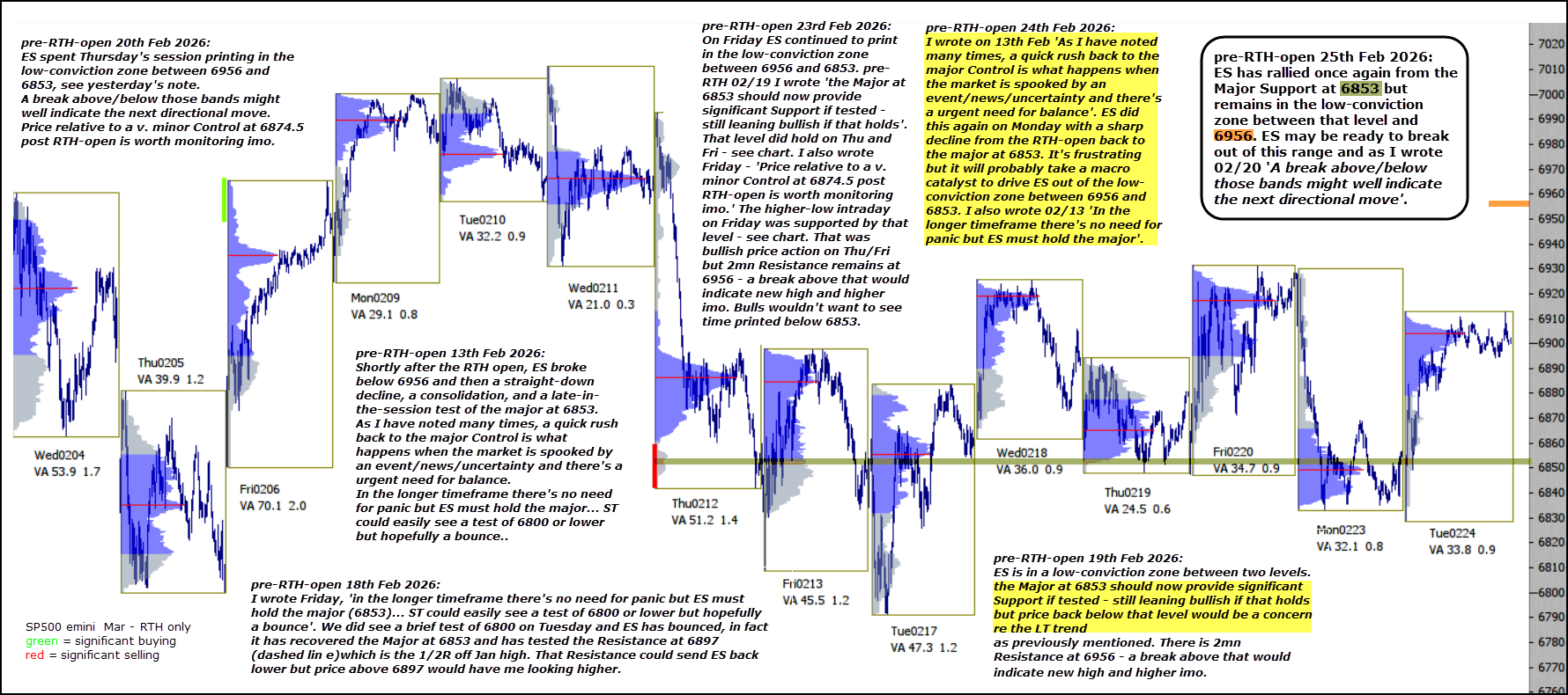 ES has rallied once again from the Major Support at 6853 but remains in the low-conviction zone between that level and 6956.