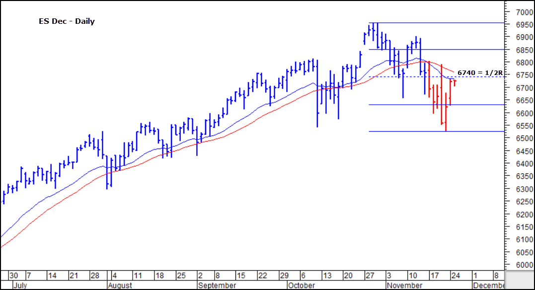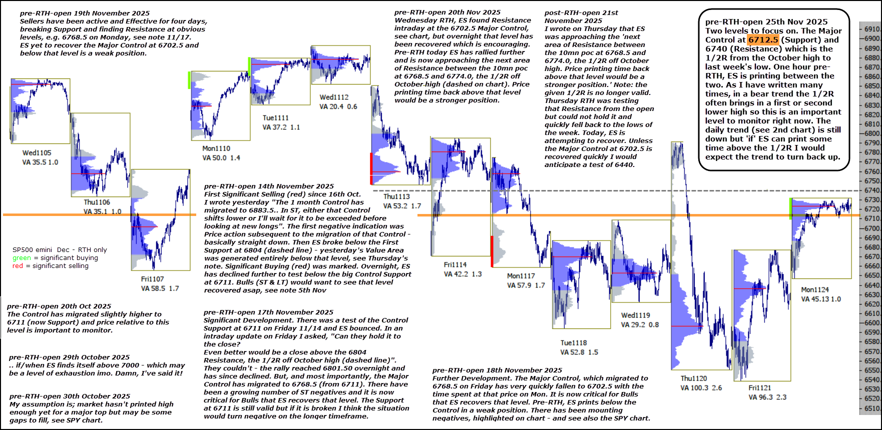 Two levels to focus on. The Major Control at 6712.5 (Support) and 6740 (Resistance) which is the 1/2R from the October high to last week’s low. One hour pre-RTH, ES is printing between the two.