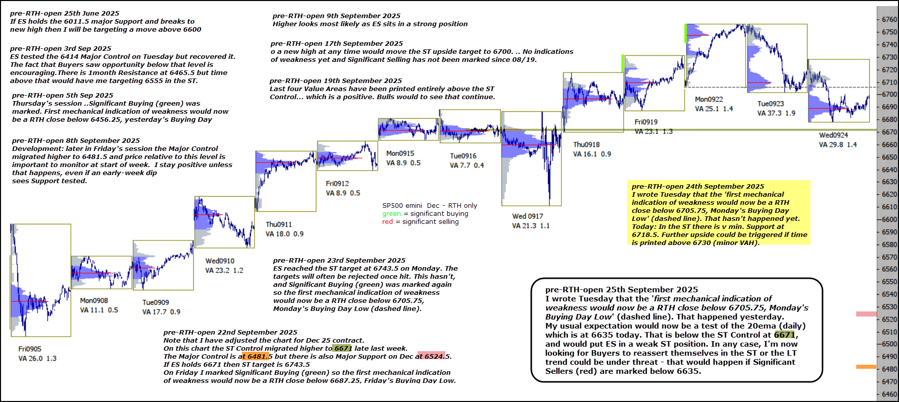 I wrote Tuesday that the ‘first mechanical indication of weakness would now be a RTH close below 6705.75, Monday’s Buying Day Low’ (dashed line). That happened yesterday. My usual expectation would now be a test of the 20ema (daily) which is at 6635 today. That is below the ST Control at 6671, and would put ES in a weak ST position.
