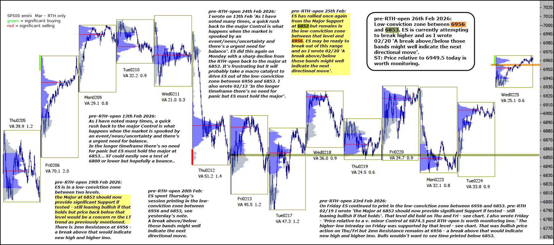 Low-conviction zone between 6956 and 6853. ES is currently attempting to break higher and as I wrote 02/20 ‘A break above/below those bands might well indicate the next directional move‘.