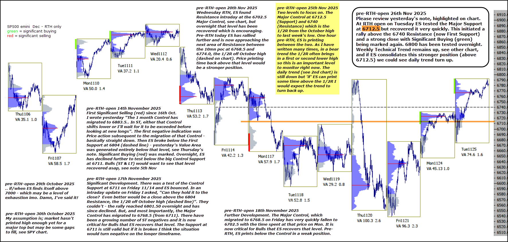 At RTH open on Tuesday ES tested the Major Support at 6712.5 but recovered it very quickly. This initiated a rally above the 6740 Resistance (now First Support) and a strong close with Significant Buying (green) being marked again. 6800 has been tested overnight.