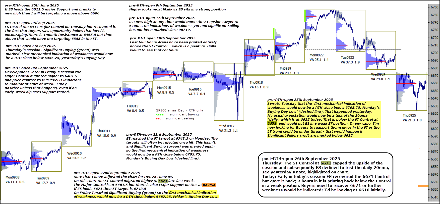 Today: Early in today’s session ES recovered the 6671 Control but gave it back; 2 hours in it is printing back below the Control in a weak position. Buyers need to recover 6671 or further weakness would be indicated; I’d be looking at 6610 initially.