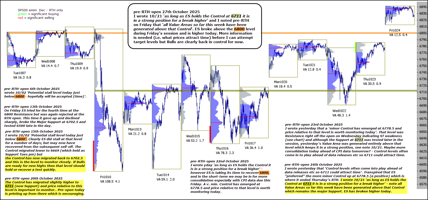 I wrote 10/21 ‘as long as ES holds the Control at 6711 it is in a strong position for a break higher‘ and I noted pre-RTH on Friday that ‘all Value Areas so far this week have been generated above that Control‘.