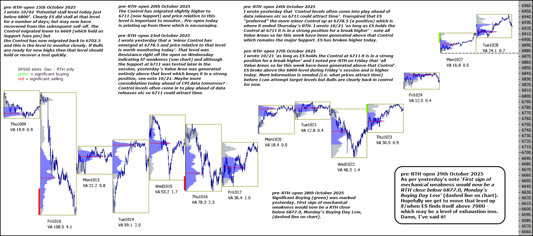 As per yesterday’s note ‘First sign of mechanical weakness would now be a RTH close below 6877.0, Monday’s Buying Day Low‘ (dashed line on chart).
