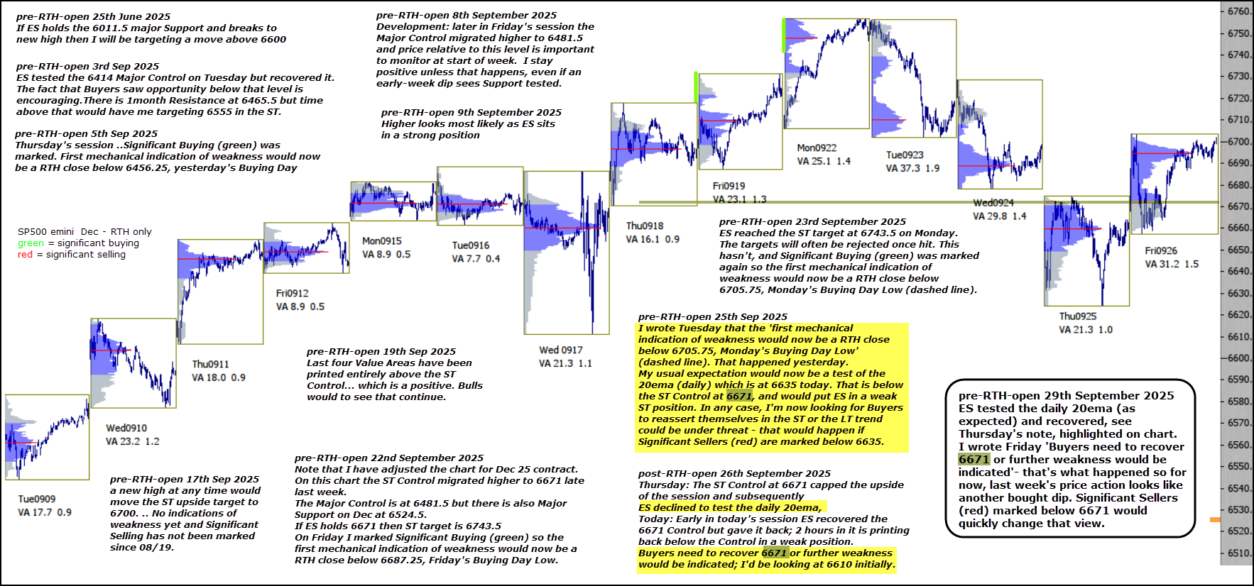 ES tested the daily 20ema (as expected) and recovered, see Thursday’s note, highlighted on chart. I wrote Friday ‘Buyers need to recover 6671 or further weakness would be indicated‘- that’s what happened so for now, last week’s price action looks like another bought dip. Significant Sellers (red) marked below 6671 would quickly change that view.