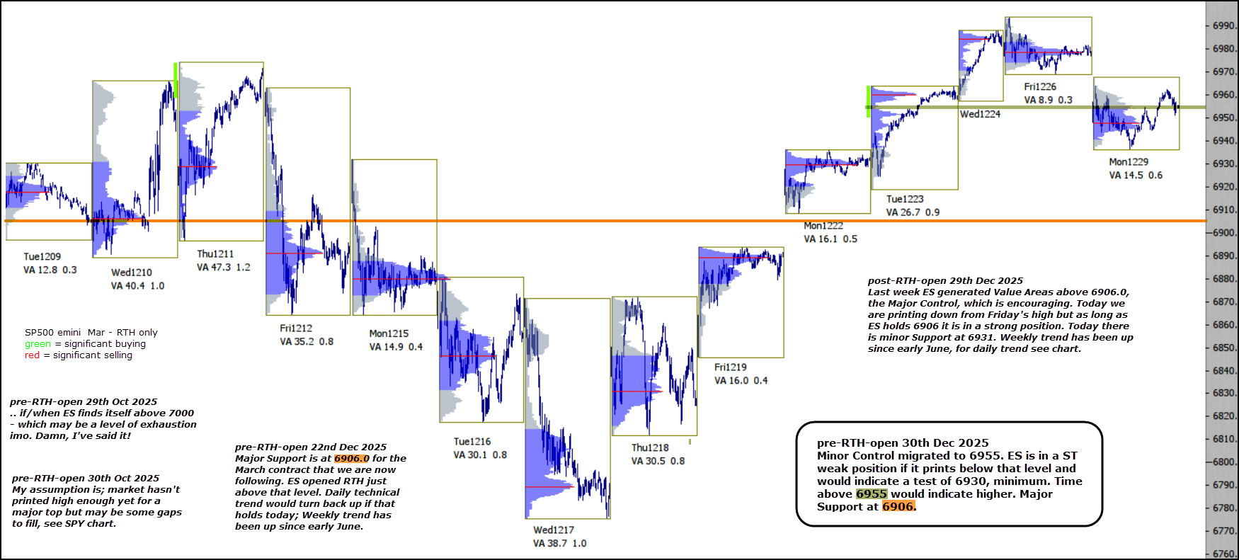Minor Control migrated to 6955. ES is in a ST weak position if it prints below that level and would indicate a test of 6930, minimum. Time above 6955 would indicate higher. Major Support at 6906.