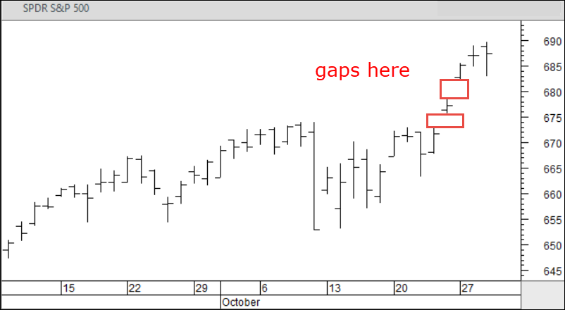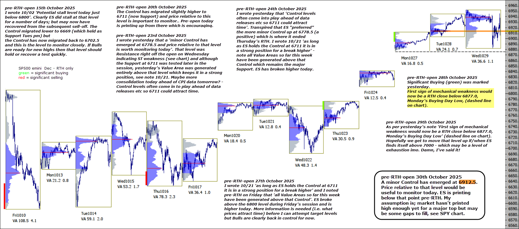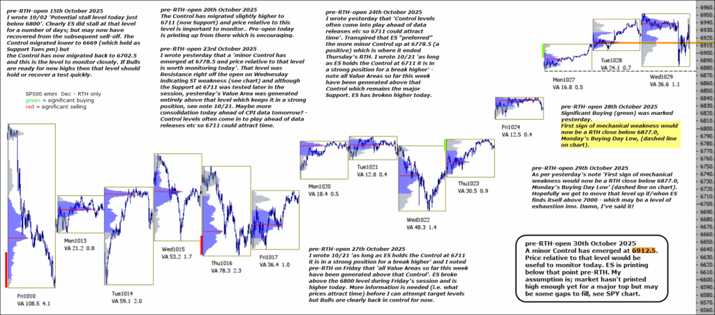 A minor Control has emerged at 6912.5. Price relative to that level would be useful to monitor today. ES is printing below that point pre-RTH. My assumption is; market hasn’t printed high enough yet for a major top but may be some gaps to fill, see SPY chart below.