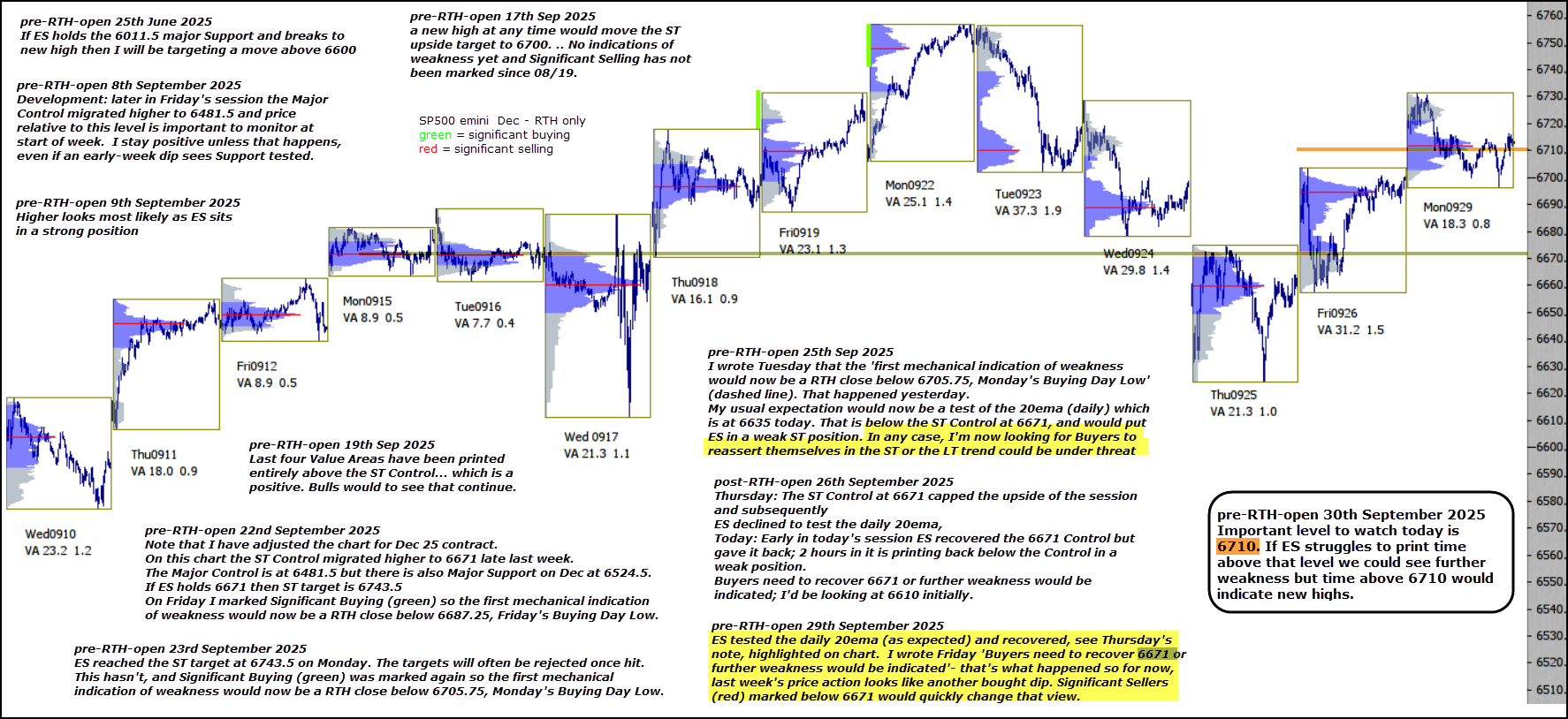 E-mini S&P 500 futures 30th September 2025 Posted on September 30, 2025 Written by Chart Prophet Important level to watch today is 6710. If ES struggles to print time above that level we could see further weakness but time above 6710 would indicate new highs.