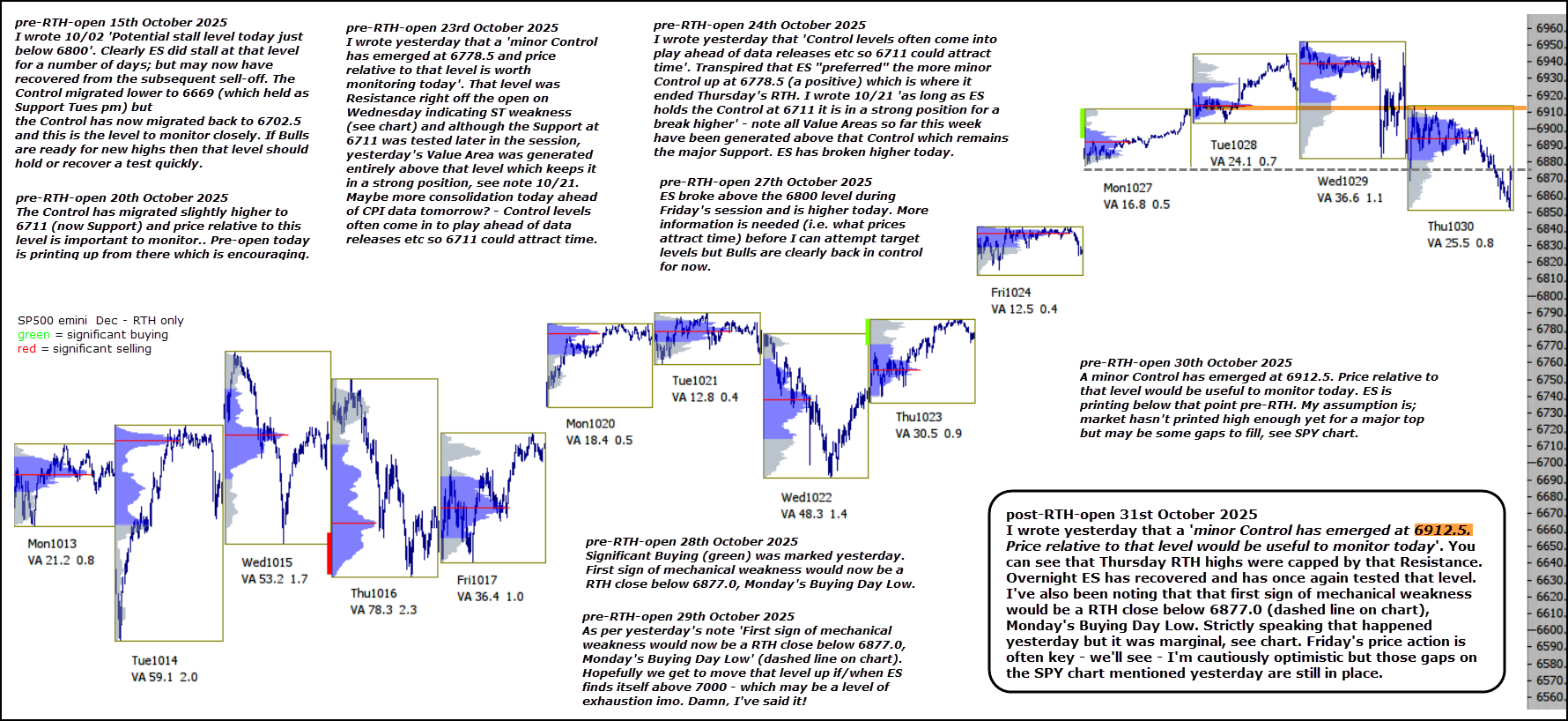 I wrote yesterday that a ‘minor Control has emerged at 6912.5. Price relative to that level would be useful to monitor today‘. You can see that Thursday RTH highs were capped by that Resistance. Overnight ES has recovered and has once again tested that level.