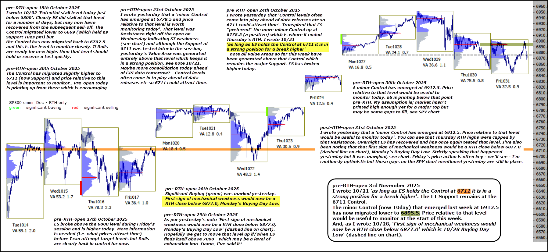 And, as I wrote 10/28, ‘First sign of mechanical weakness would now be a RTH close below 6877.0′ which is 10/28 Buying Day Low‘ (dashed line on chart).