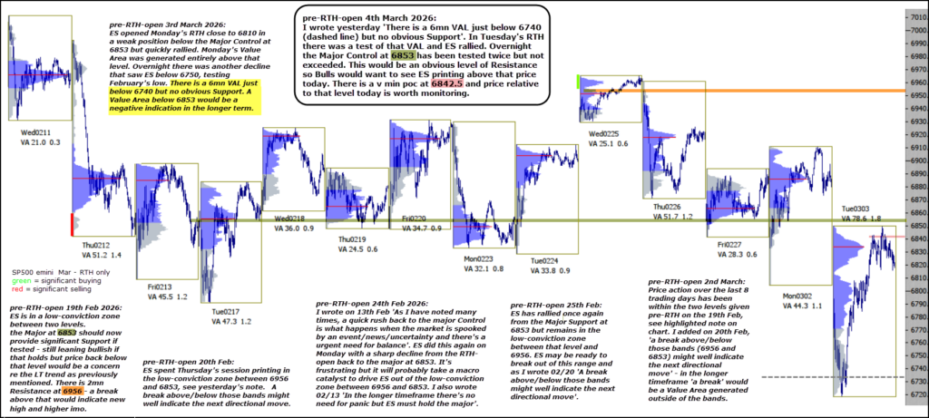 I wrote yesterday ‘There is a 6mn VAL just below 6740 (dashed line) but no obvious Support‘. In Tuesday’s RTH there was a test of that VAL and ES rallied. Overnight the Major Control at 6853 has been tested twice but not exceeded. This would be an obvious level of Resistance so Bulls would want to see ES printing above that price today.