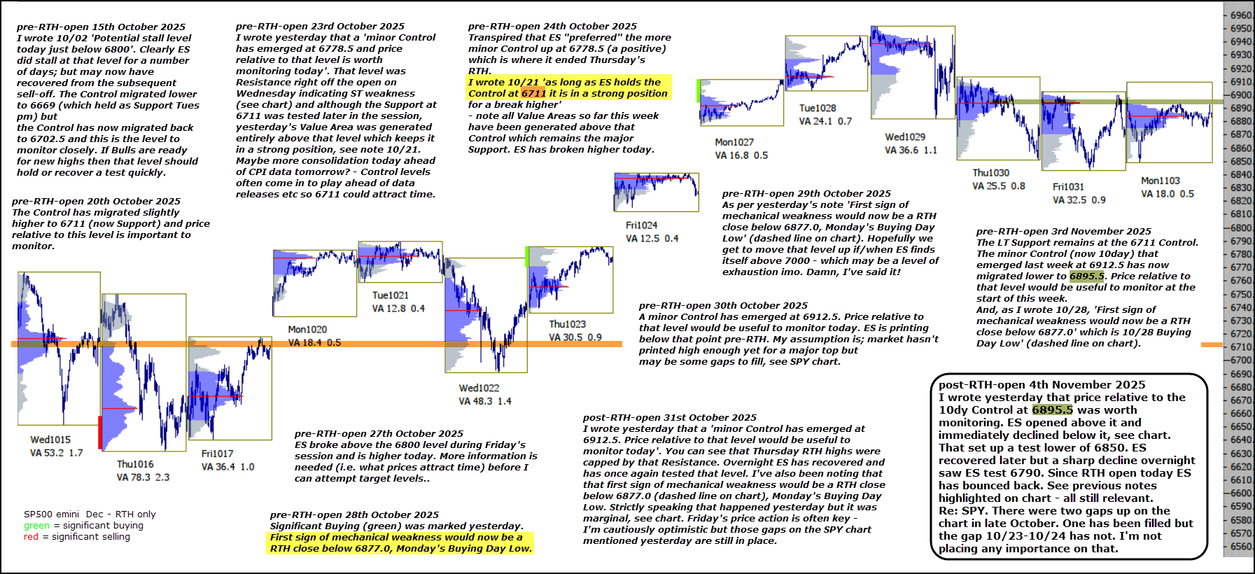 I wrote yesterday that price relative to the 10dy Control at 6895.5 was worth monitoring. ES opened above it and immediately declined below it, see chart. That set up a test lower of 6850. ES recovered later but a sharp decline overnight saw ES test 6790. Since RTH open today ES has bounced back. See previous notes highlighted on chart – all still relevant.