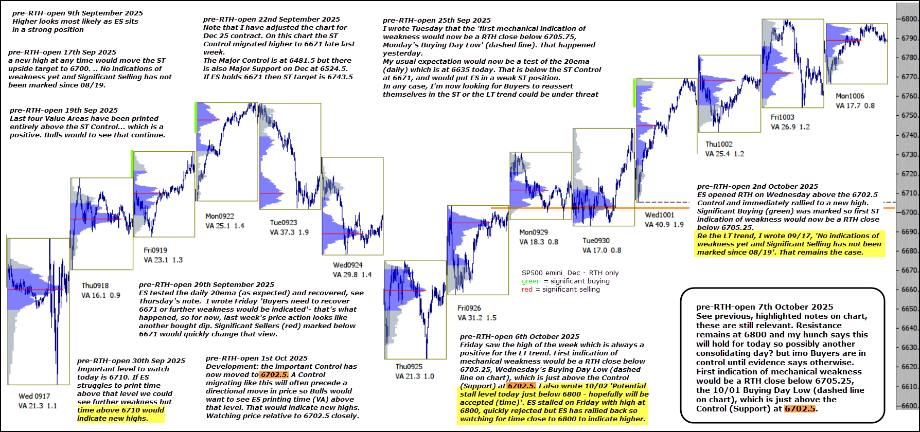 First indication of mechanical weakness would be a RTH close below 6705.25, the 10/01 Buying Day Low (dashed line on chart), which is just above the Control (Support) at 6702.5.