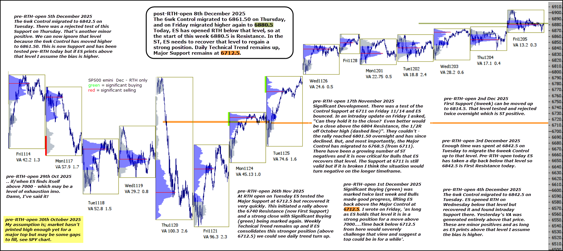 The 6wk Control migrated to 6861.50 on Thursday, and on Friday migrated higher again to 6880.5 Today, ES has opened RTH below that level, so at the start of this week 6880.5 is Resistance. In the ST, ES needs to recover that level to regain a strong position. Daily Technical Trend remains up, Major Support remains at 6712.5.