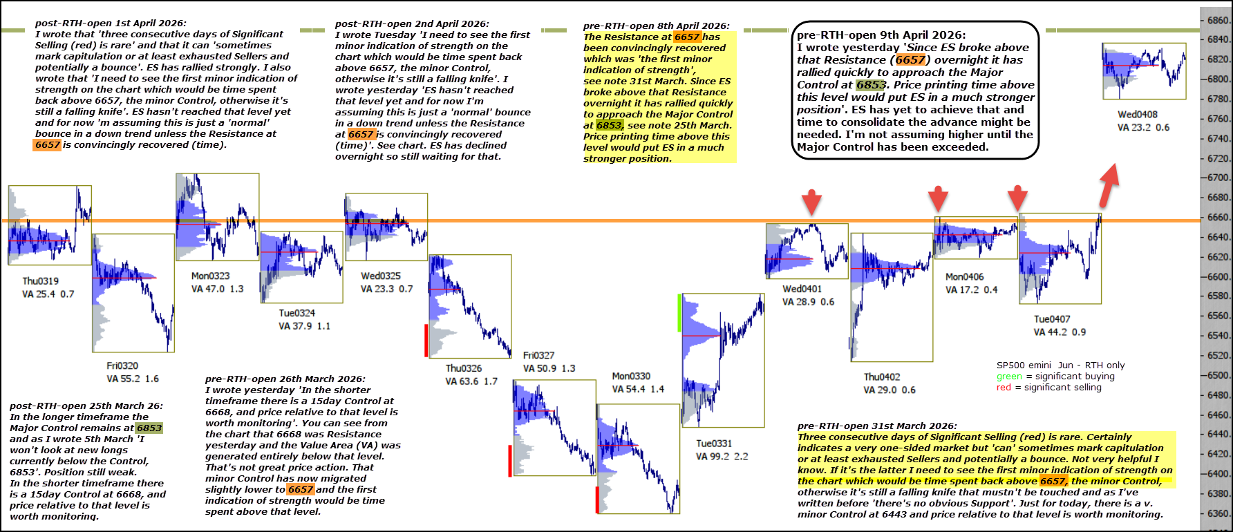 I wrote yesterday ‘Since ES broke above that Resistance (6657) overnight it has rallied quickly to approach the Major Control at 6853. Price printing time above this level would put ES in a much stronger position‘.