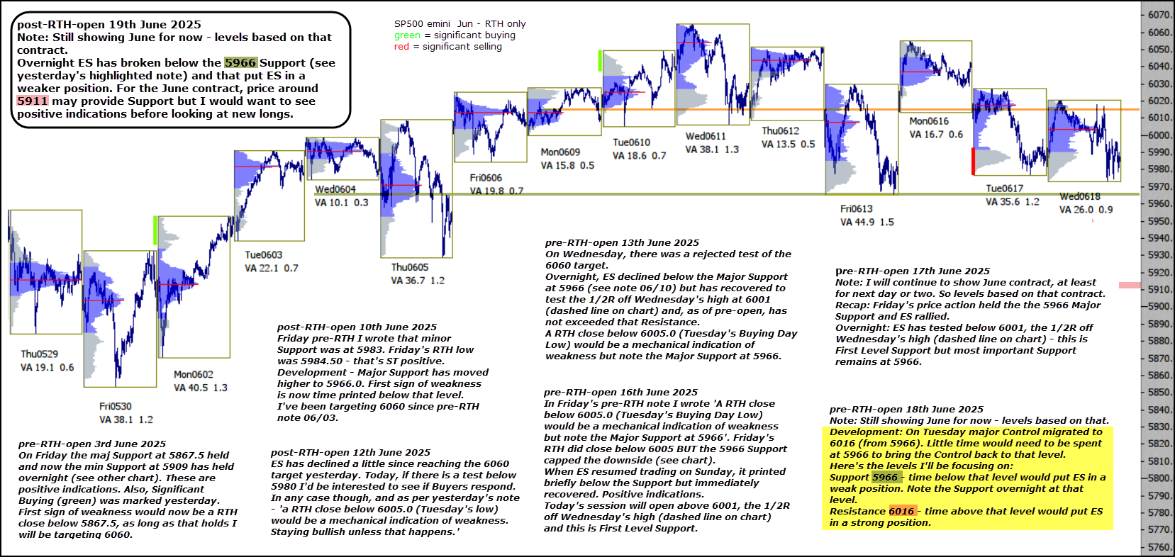 Overnight ES has broken below the 5966 Support (see yesterday’s highlighted note) and that put ES in a weaker position. For the June contract, price around 5911 may provide Support but I would want to see positive indications before looking at new longs.