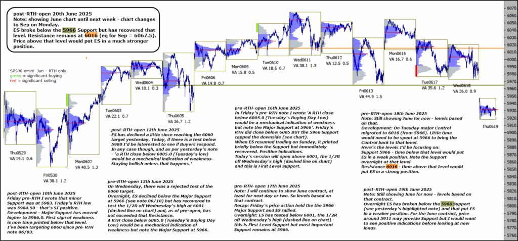 ES broke below the 5966 Support but has recovered that level. Resistance remains at 6016 (eq for Sep = 6067.5). Price above that level would put ES in a much stronger position.