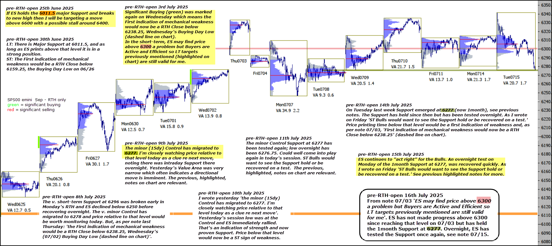 From note 07/03 ‘ES may find price above 6300 a problem but Buyers are Active and Efficient so LT targets previously mentioned are still valid for me‘. ES has not made progress above 6300 since reaching that level on 07/03 but has held the 1month Support at 6277. Overnight, ES has tested the Support once again, see note 07/15.