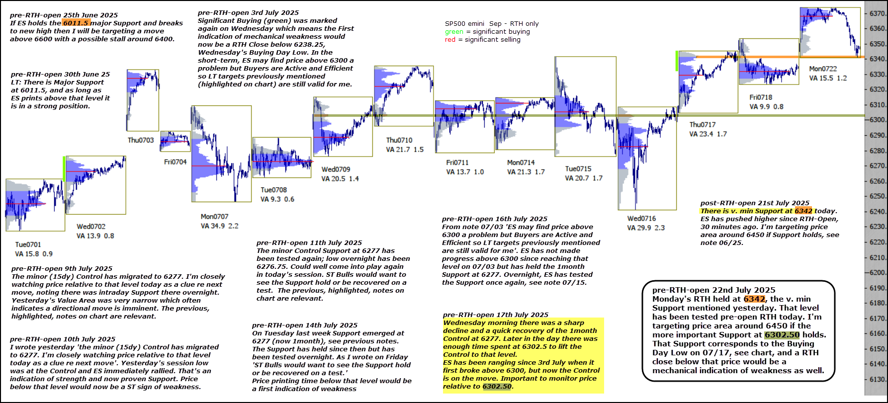 Monday’s RTH held at 6342, the v. min Support mentioned yesterday. That level has been tested pre-open RTH today. I’m targeting price area around 6450 if the more important Support at 6302.50 holds. That Support corresponds to the Buying Day Low on 07/17, see chart, and a RTH close below that price would be a mechanical indication of weakness as well.