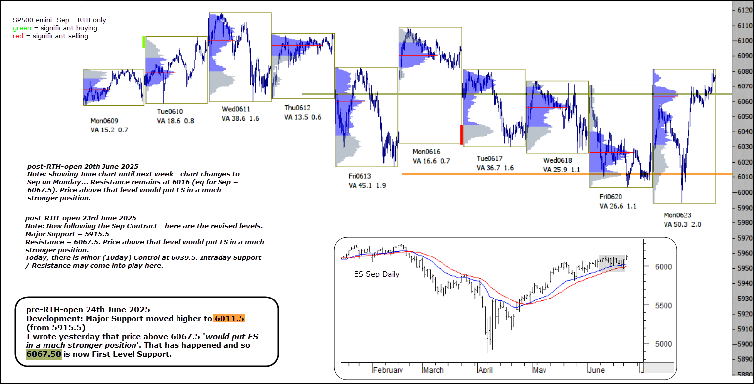 I wrote yesterday that price above 6067.5 ‘would put ES in a much stronger position‘. That has happened and so 6067.50 is now First Level Support.