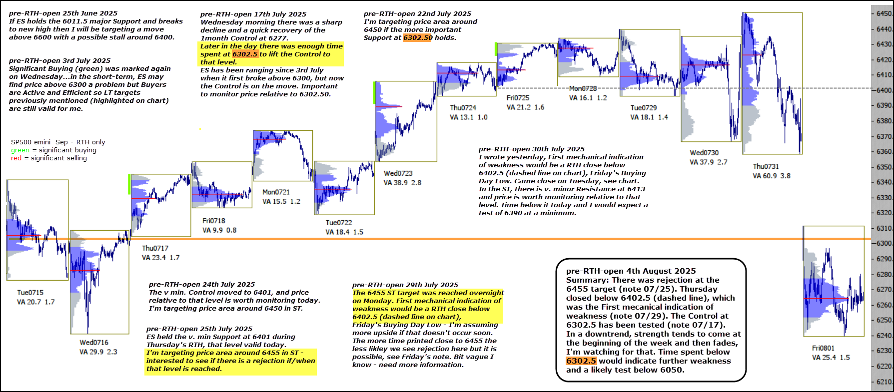 Summary: There was rejection at the 6455 target (note 07/25). Thursday closed below 6402.5 (dashed line on chart), which was the First mechanical indication of weakness (note 07/29). The Control at 6302.5 has been tested (note 07/17).
