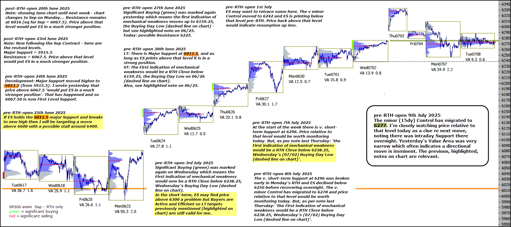 The minor (15dy) Control has migrated to 6277. I’m closely watching price relative to that level today as a clue re next move, noting there was intraday Support there overnight. Yesterday’s Value Area was very narrow which often indicates a directional move is imminent. The previous, highlighted, notes on chart are relevant.